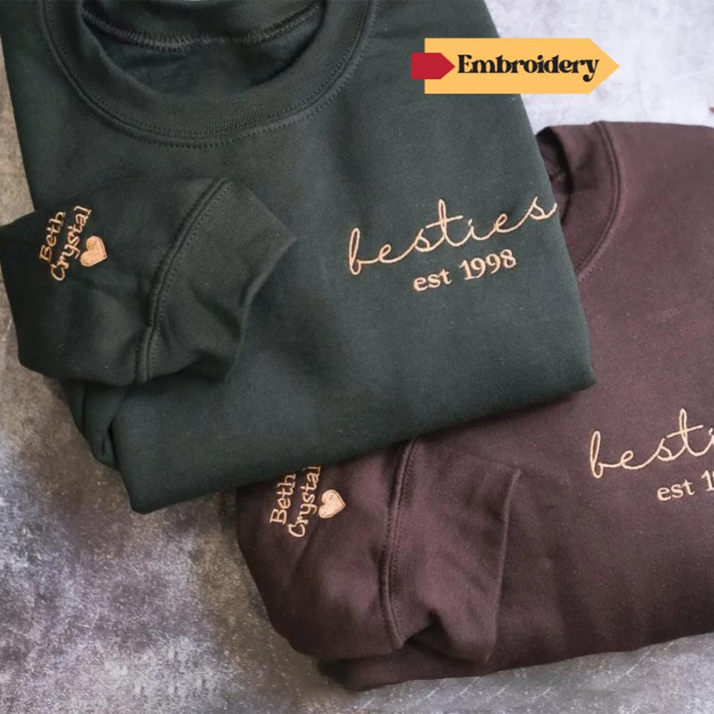 Celebrate your lifelong friendship with these custom embroidered Bestie Sweatshirts! Designed with love and a personal touch, each sweatshirt features the word "besties" with the year of establishment to mark the special bond you share. Plus, the sleeves are personalized with each of your names and a heart symbol, adding that extra sentimental detail to make this sweatshirt truly unique.