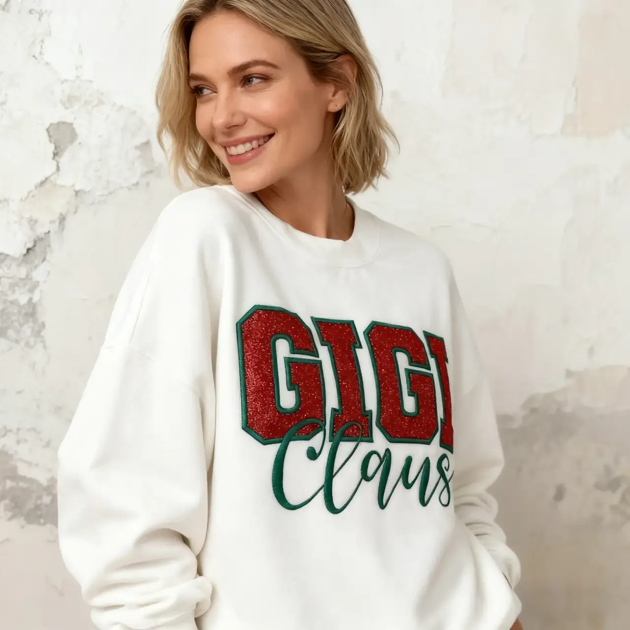 Custom Embroidered Glitter Gigi Mimi Mama Claus Sweatshirt with Names on Sleeve
