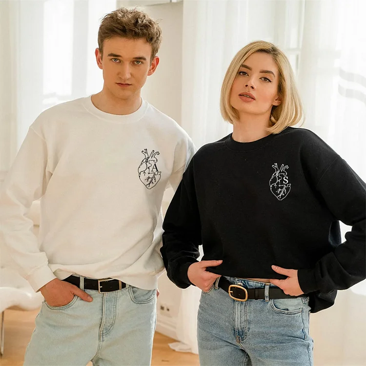 Embroidered Anatomical Heart Sweatshirt, Custom Sweatshirt with Initials on Sleeve, Couple Matching Anniversary Hoodies, Couple Gift