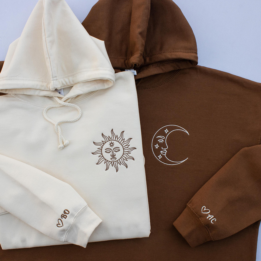 Embroidered Sun and Moon Couples Hoodies with Initial and heart on the sleeve. The perfect anniversary, birthday, Valentines or Christmas gift for you romantic fashionable husband, wife, boyfriend, girlfriend, or your favorite couple.