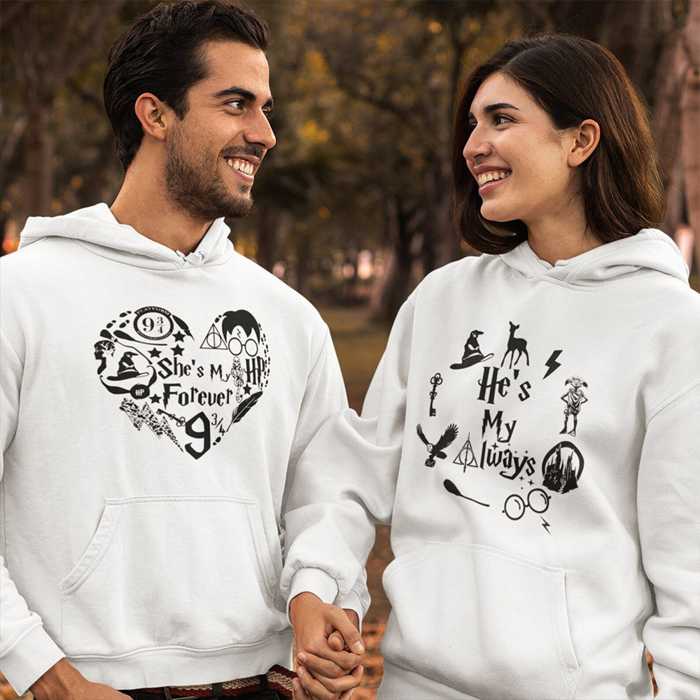 Celebrate your magical love story with these Harry Potter-themed couple hoodies! Featuring iconic symbols and characters from the Wizarding World, these hoodies are perfect for couples who share a deep connection. One hoodie reads "She's My Forever" and the other "He's My Always", surrounded by personalized Harry Potter elements like the Lightning Bolt, Time-Turner, and Platform 9¾.