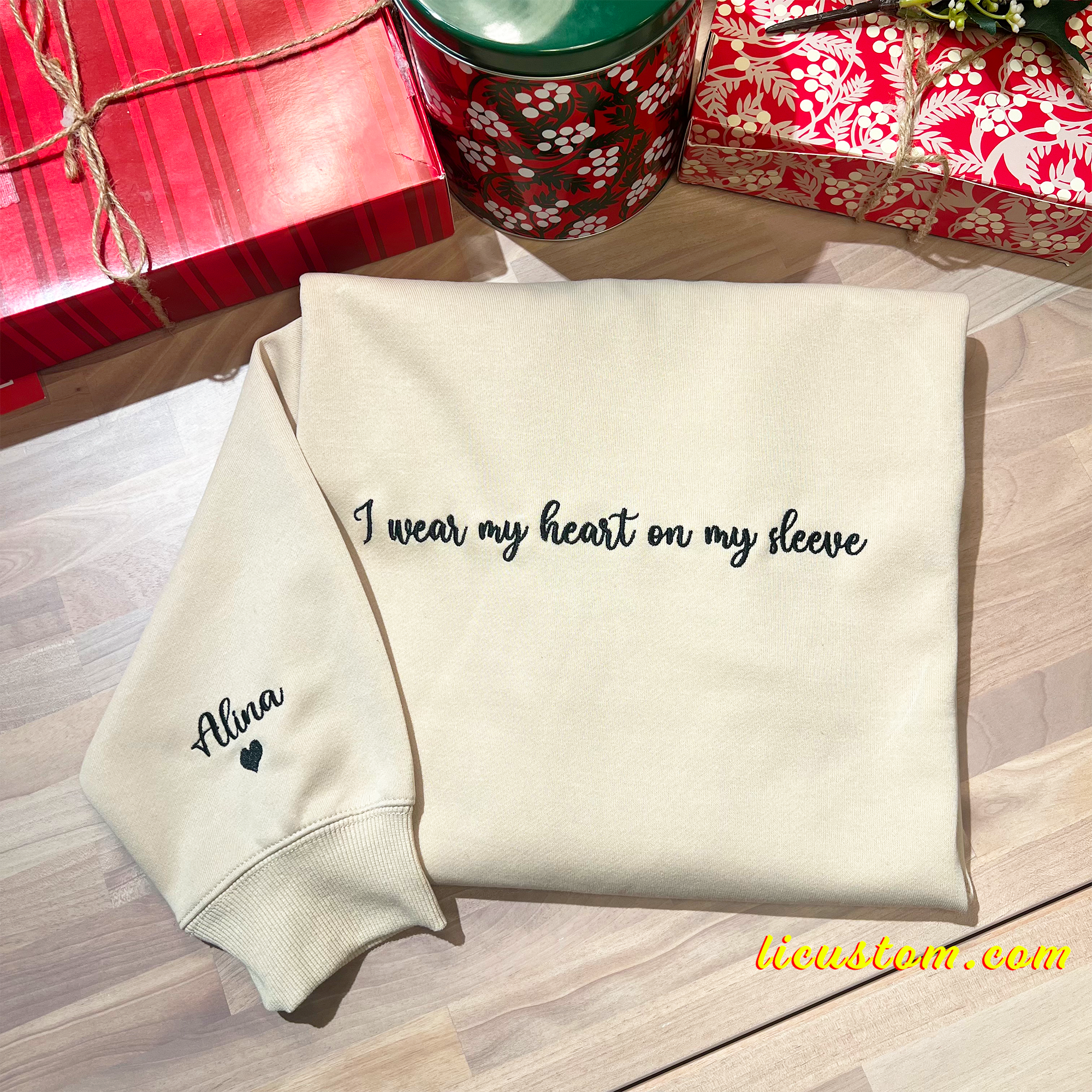 I Wear My Heart On My Sleeve Embroidered Sweatshirt, Custom Embroidered Mama Crewneck With Kids Names, Gift For New Mom