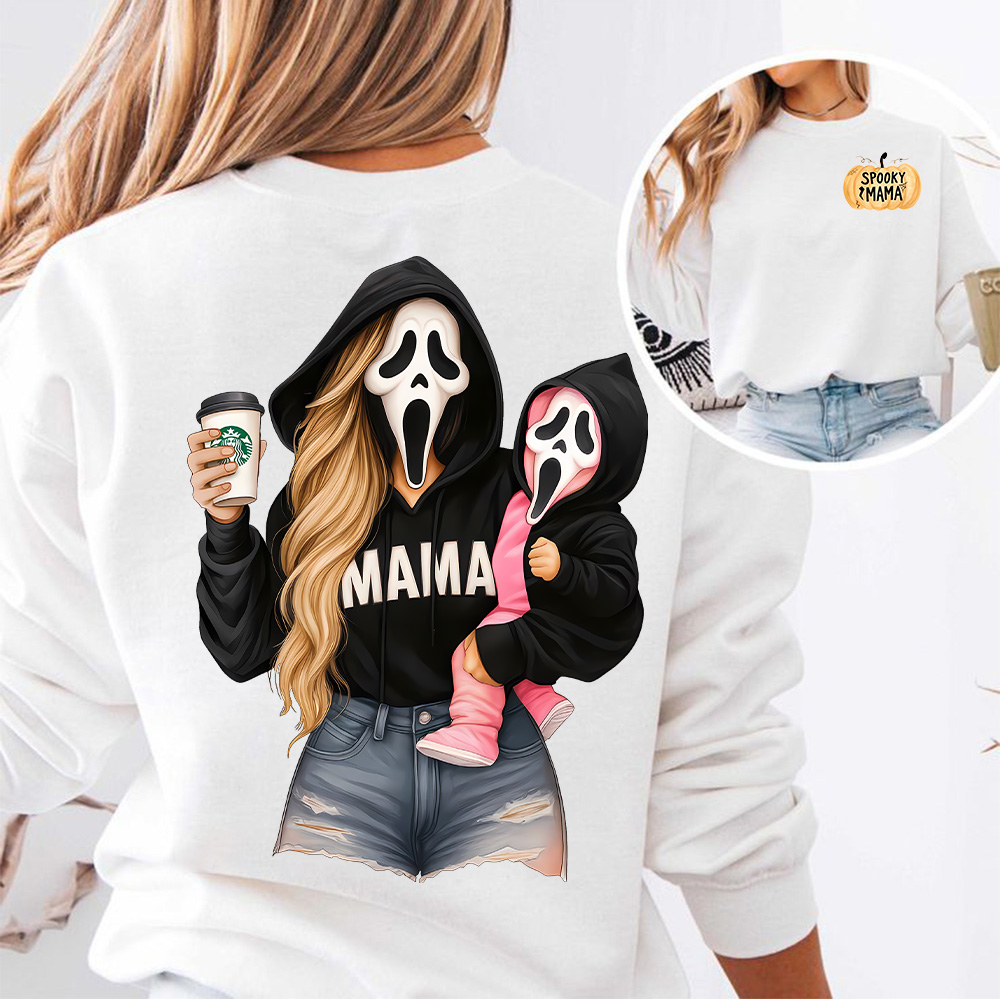 Spooky Mama: Ghost Face sweatshirt design with oversized "MAMA" print